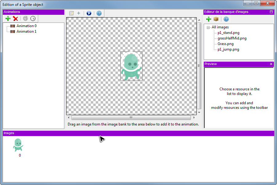 Eliges la imagen llamada p1_stand en la carpeta del proyecto y haces clic en abrir. Luego de agregar esta imagen, cierras el editor de objetos y lo arrastras en la zona gris.