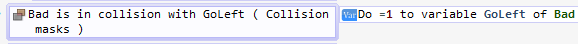 A diferencia de antes, no utilizamos una variable de escena sino una variable de objeto. (Esta acción puede encontrarse en Todos los objetos > Variables ). Cada vez que un objeto Bad esté colisionando con un objeto GoLeft, la variable GoLeft se cambiará por 1. Añadiremos un evento para mover el enemigo en un momento.